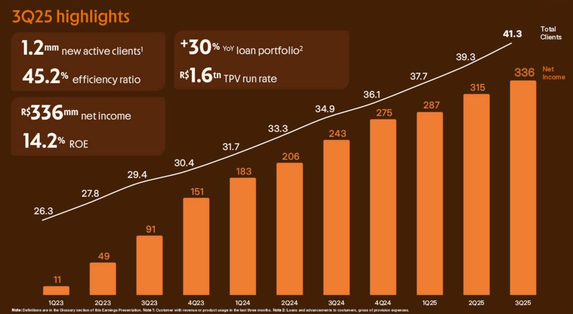 Efficiency and profitability ratios showed marked improvement, moving the company closer to its long-term strategic targets. The efficiency ratio improved by 190 basis points during the quarter, dropping from 47.1% to 45.2%, as total expense growth was limited to 16% year-over-year, roughly half the pace of revenue growth. This operational leverage contributed to a return on equity of 14.2%, up from 13.9% in the previous quarter. These metrics indicate that the digital banking model is successfully converting high transaction volumes and client engagement into sustainable profit margins.