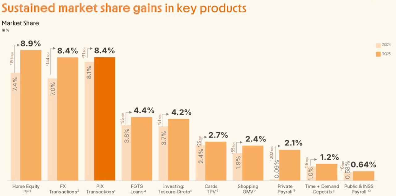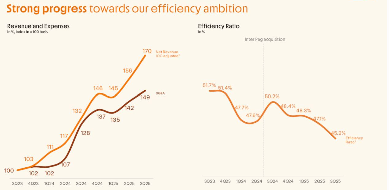 Market share gains in specialized products further diversified the revenue mix away from standard interest income. Inter & Co now holds an 8.9% market share in home equity portfolio balances for individuals, making it the second-largest underwriter of this product in Brazil. In the foreign exchange sector, driven by its Global Account offering, the company captured 8.4% of market transactions. These gains in high-margin niches, combined with a 30% growth in transaction volumes to BRL 412 billion, underscore the broad-based financial strength of the ecosystem as of late 2025. The company is making real progress toward 30% efficiency (which would rank it among the top 2-3% all time of financials we cover).