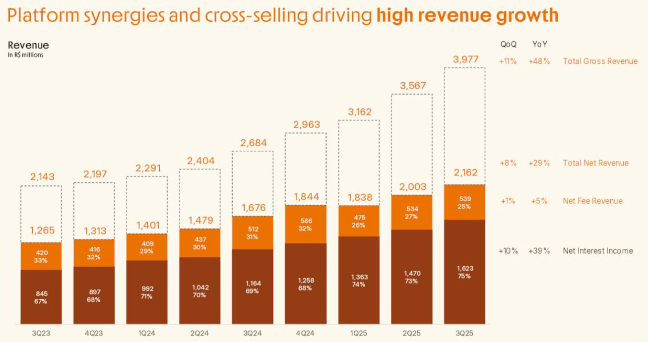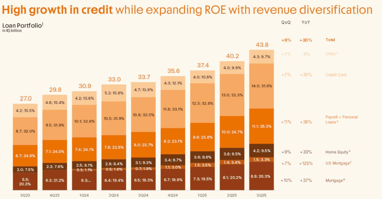 In the third quarter of 2025, Inter & Co reported record-breaking financial results characterized by a significant expansion in both its top and bottom lines. Net revenue reached BRL 2.1 billion, representing a 29% increase compared to the same period in the previous year and an 8% sequential growth from the second quarter. This revenue surge was primarily propelled by the credit vertical, where net interest income jumped 39% year-over-year. The company also achieved a milestone in profitability, posting a record net income of BRL 336 million, which reflects a 39% increase from the prior year and demonstrates the company’s ability to scale its earnings alongside its user base. The company is seeing very high growth in credit with revenue diversification.