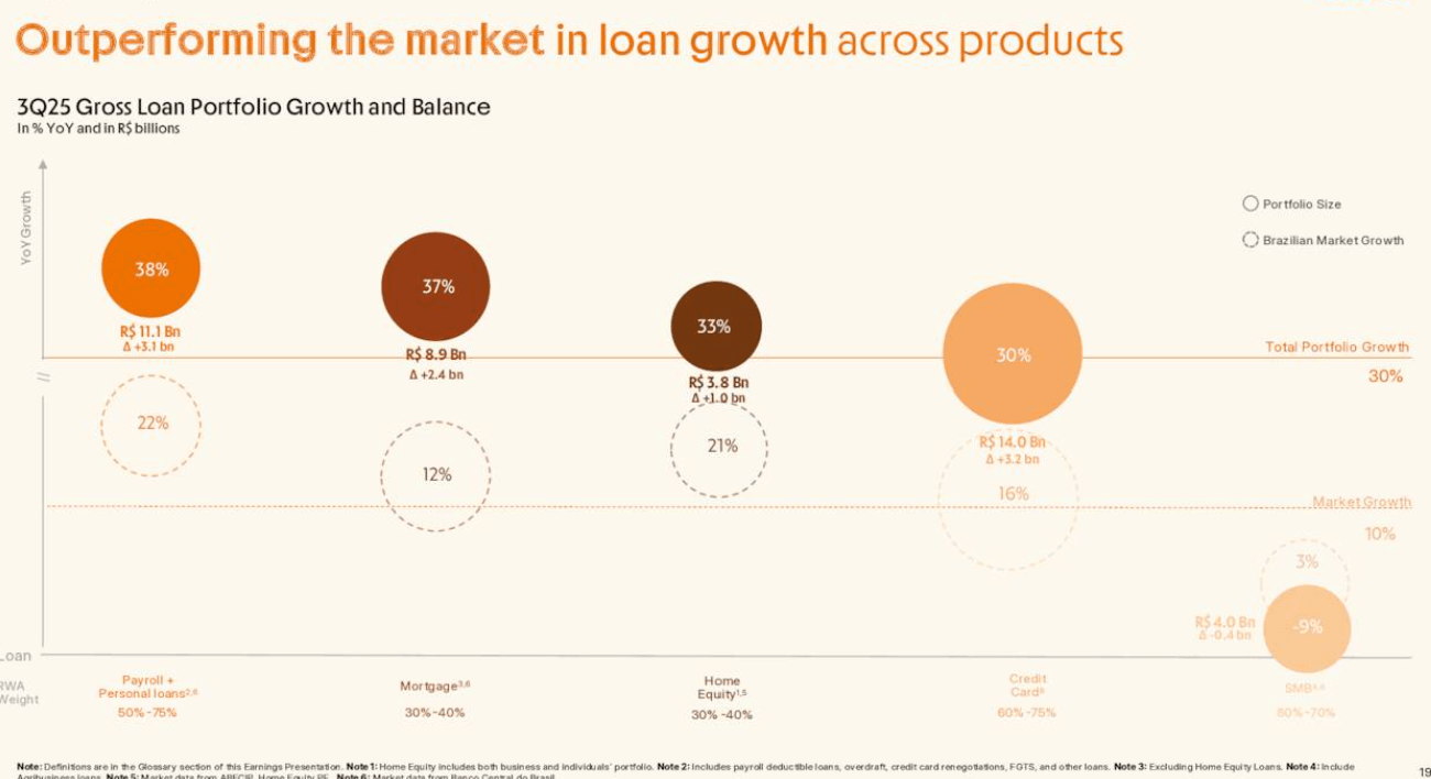 The lending operations saw substantial momentum, with the total loan book growing 30% year-over-year to reach BRL 43.8 billion. On an annualized basis, the quarterly growth accelerated to 36%, driven largely by collateralized products and the successful launch of private payroll loans. This specific payroll portfolio grew to BRL 1.3 billion within just six months of its introduction, serving over 300,000 clients. Additionally, the mortgage portfolio expanded by 37% to reach BRL 9 billion, while credit card volumes surpassed the BRL 15 billion mark for the first time, marking a 20% annual increase in total processing volume.