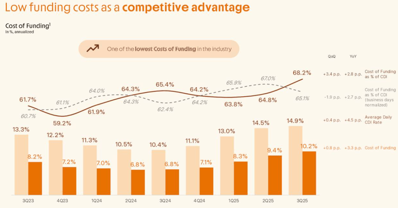 The company’s funding franchise continued to provide a competitive advantage through low-cost deposits and strong liquidity. Total funding reached BRL 68 billion, a 35% increase year-over-year, led primarily by time deposits and transactional balances. The cost of funding was maintained at a highly efficient 68.2% of the Interbank Deposit Rate (CDI), or 55.1% when adjusted for business days. Notably, the average deposit per active client surpassed BRL 2,000 for the first time, signaling deeper trust and primary bank status among its 24 million active users.