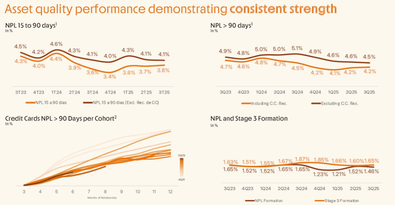 Asset quality remained resilient despite the aggressive expansion of the credit portfolio. The 90-day non-performing loan ratio improved slightly, decreasing by 10 basis points to 4.5%, while the 15-to-90-day delinquency rate held steady at 4.1%. The cost of risk was reported at 5.35%, an increase largely attributed to the upfront provisioning required for the rapidly growing private payroll portfolio. However, management noted that the return profile of this new portfolio has already passed its break-even point and is expected to contribute high levels of profitability in future quarters.